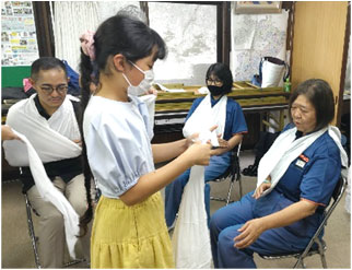普段使う機会の少ない三角巾ですが、使い方を学ぶことで、けがの応急処置にとても役立つことを実感しました。いざという時に備えて、訓練の積み重ねが大切だと改めて感じました。