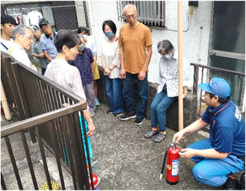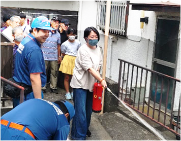 消防団の皆さんに消火器の使い方を教わったあと、一人一人が水消火器を使って初期消火にチャレンジ! 実際に使うことで身につく大切さを実感しました。